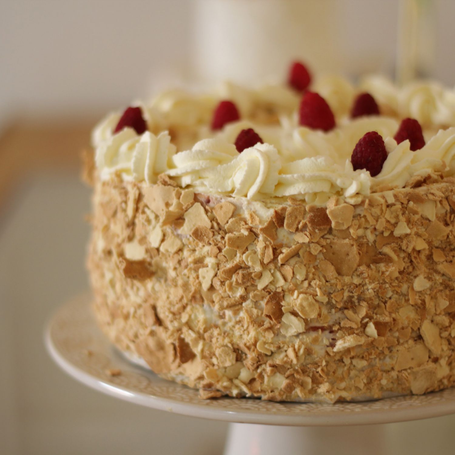 Hojarasca de alfajor, relleno crema chantilly, frambuesas, crema pastelera y manjar.